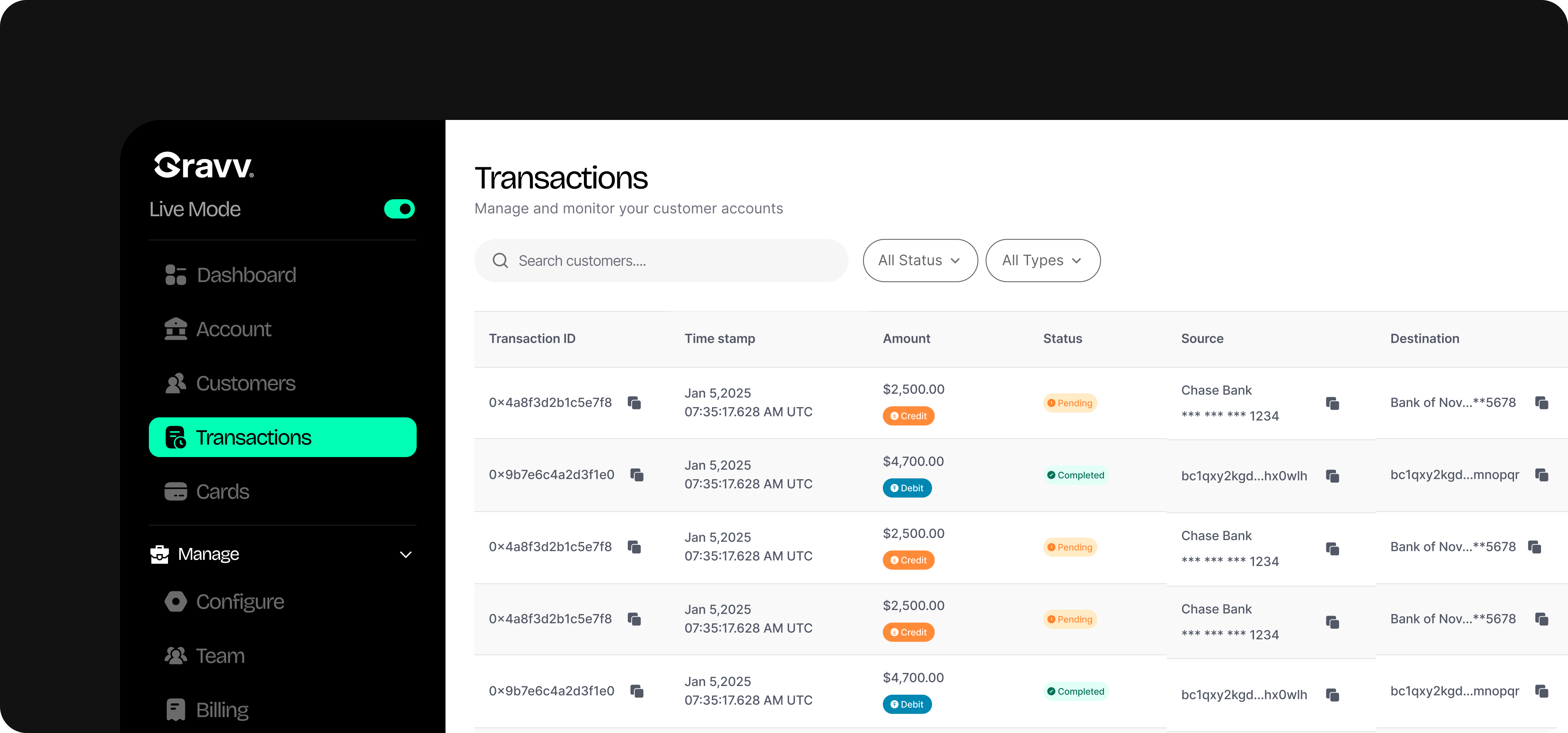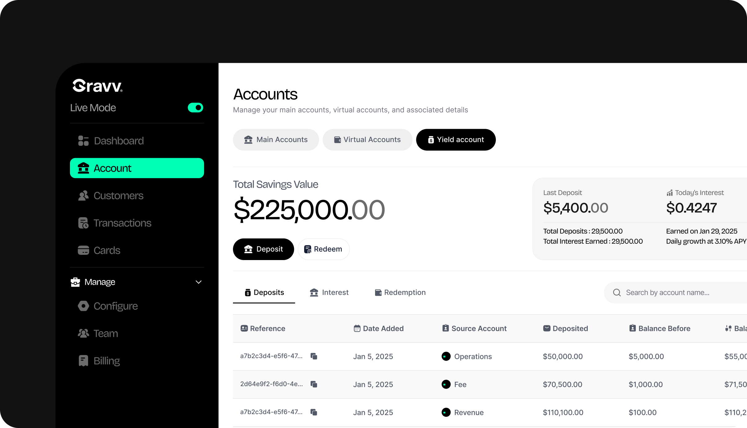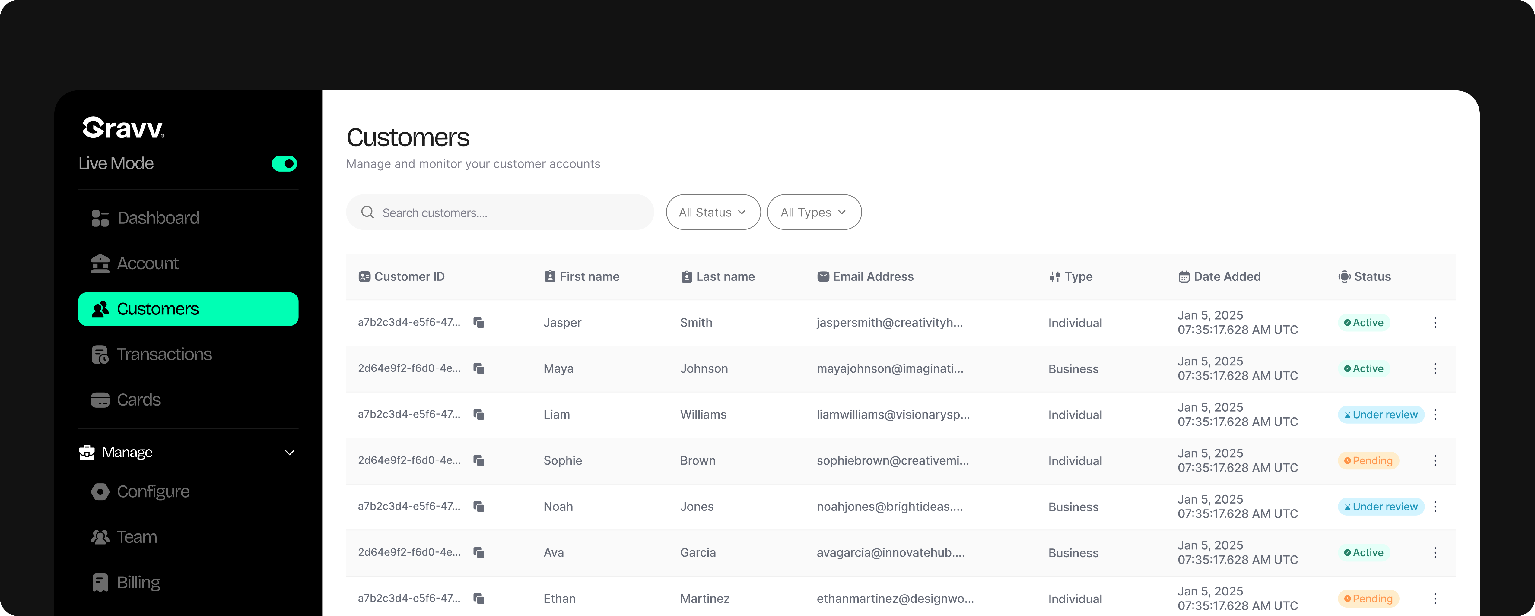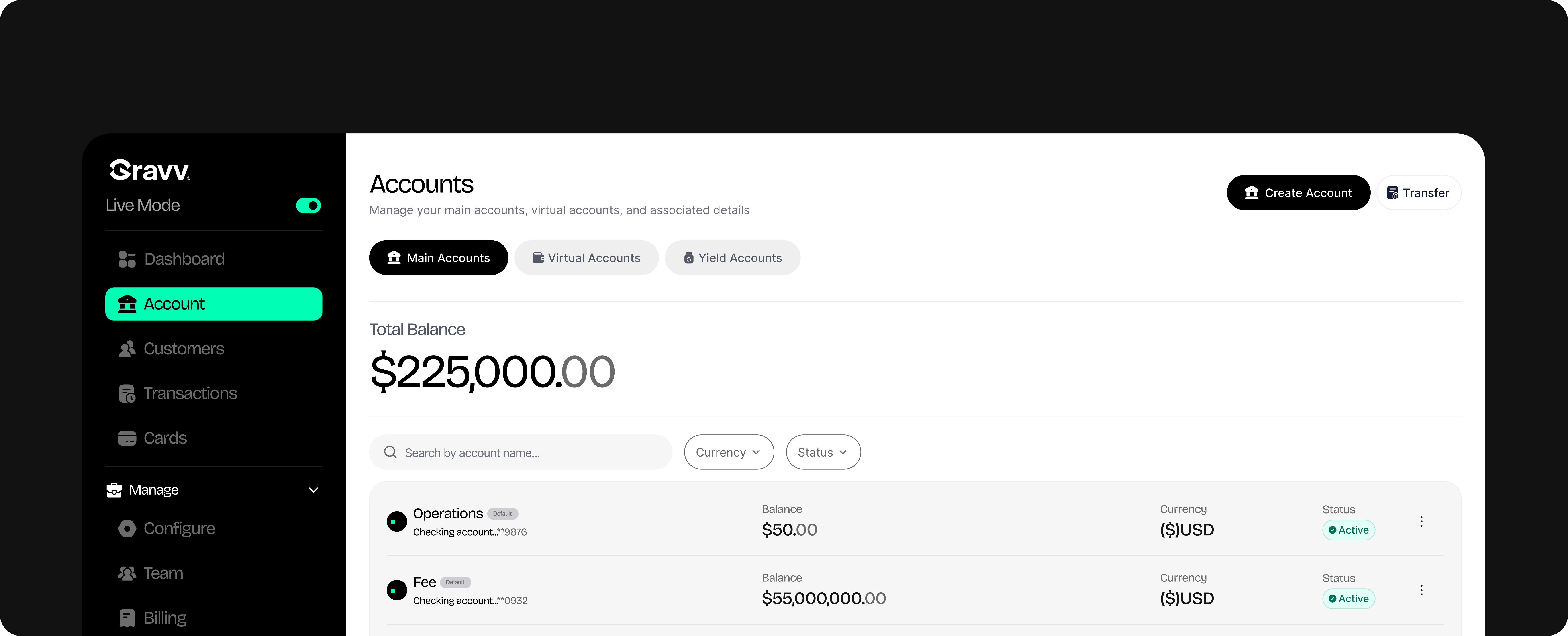 Main accounts belong to your business and are used to manage operational funds such as revenue, payouts, card-backed balances, or longer-term holdings. Customer accounts belong to your users and reflect money they send, receive, or hold through your product. Keeping these separate helps maintain clarity around ownership and activity.