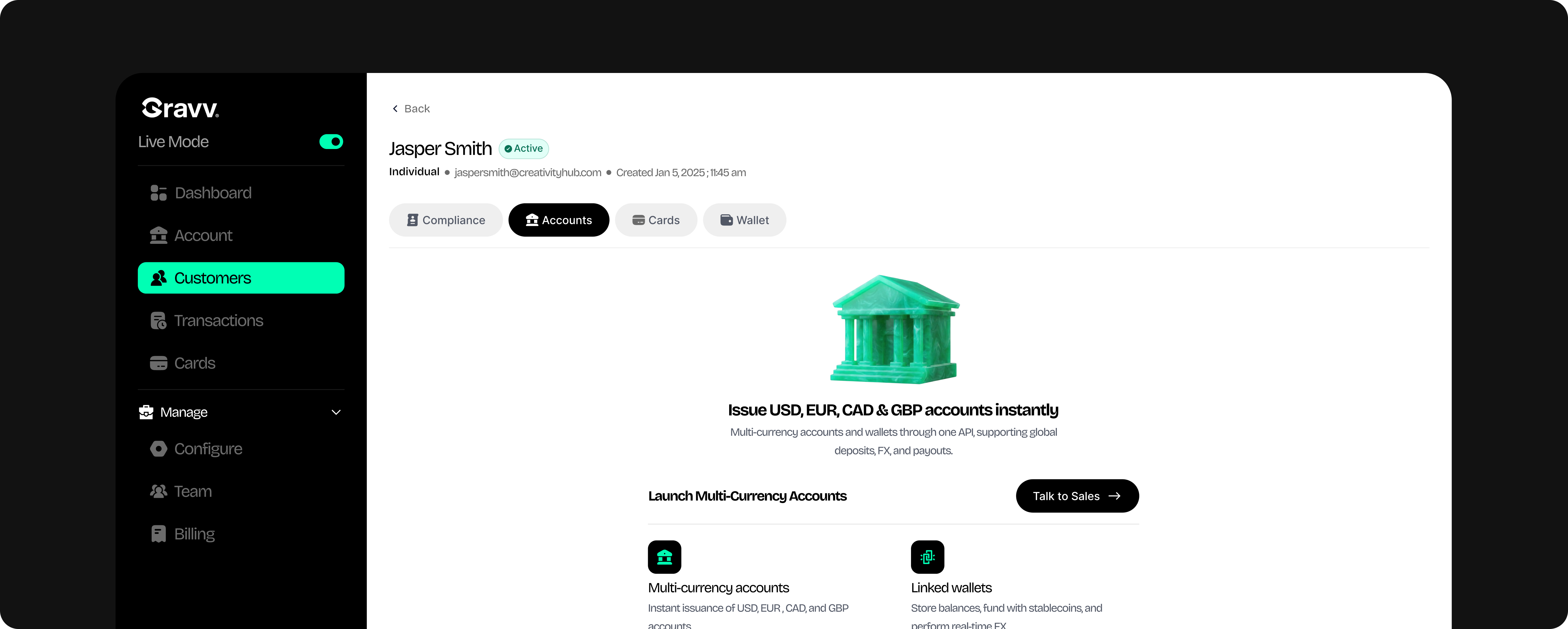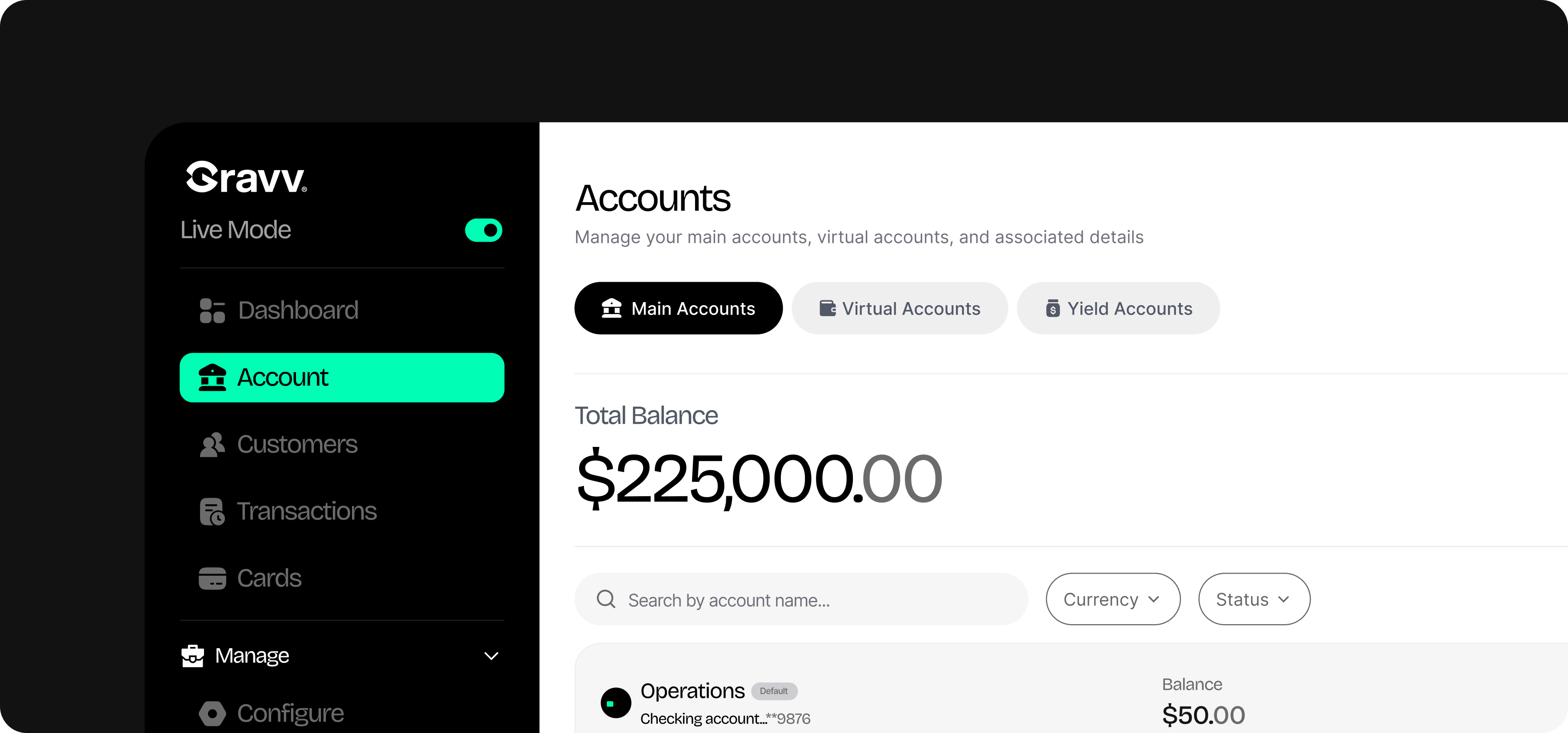 Gravv provides the infrastructure FX and liquidity providers need to hold funds, move money, and settle across currencies, without stitching together multiple vendors.