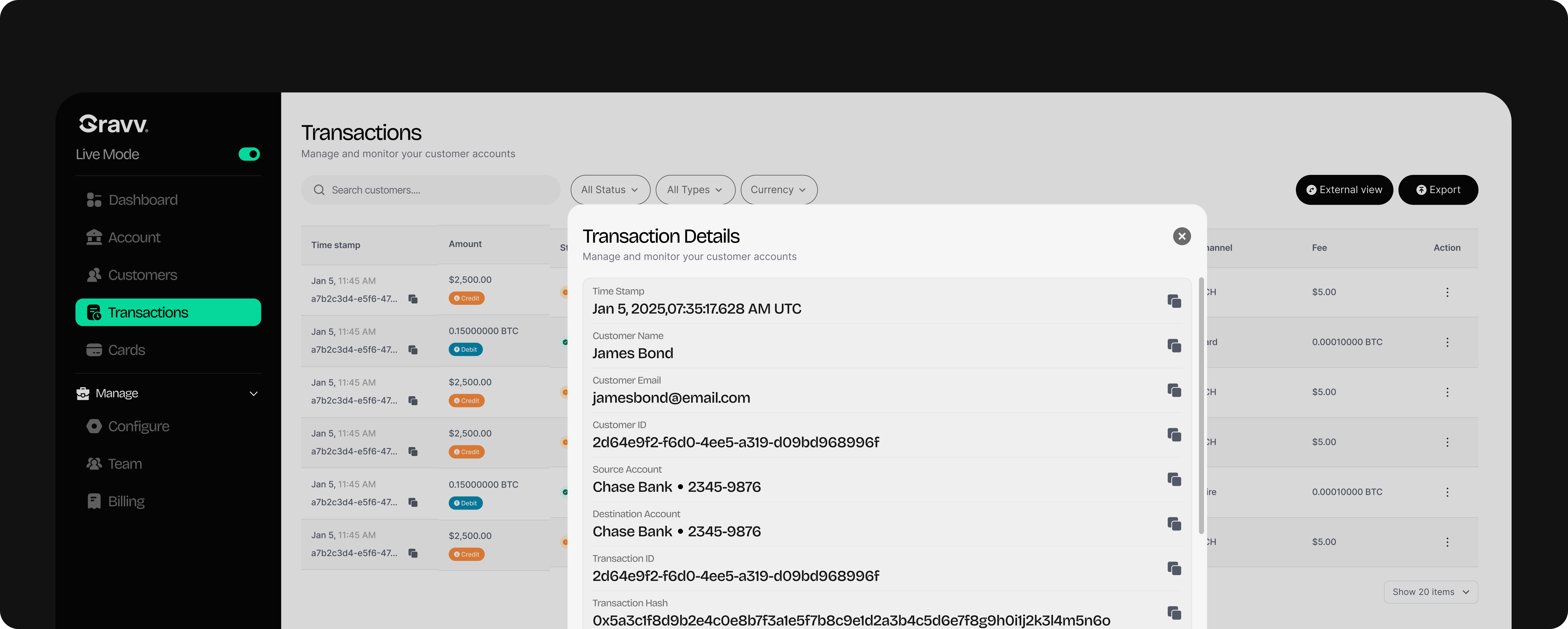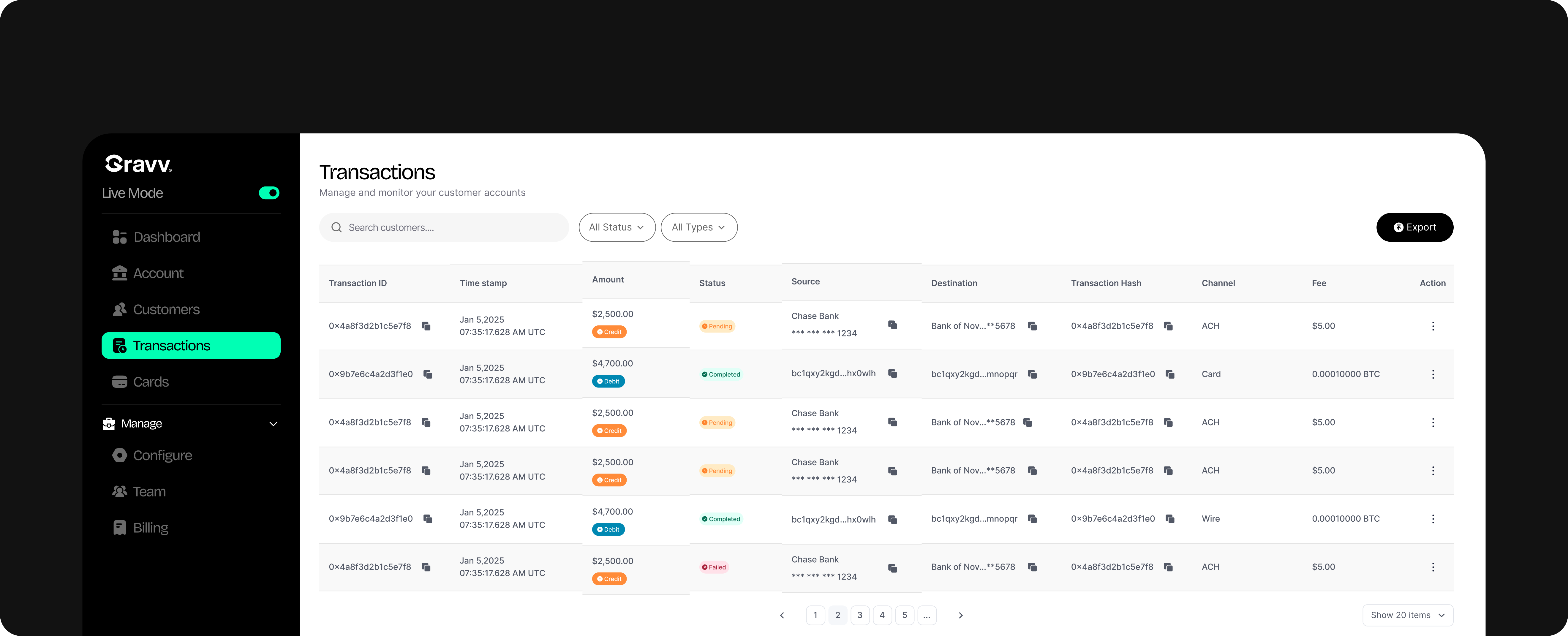 Gravv supports four transfer types: internal transfers between Gravv accounts, external fiat transfers using local banking rails, international transfers to bank and mobile money accounts, and digital transfers between wallet addresses.